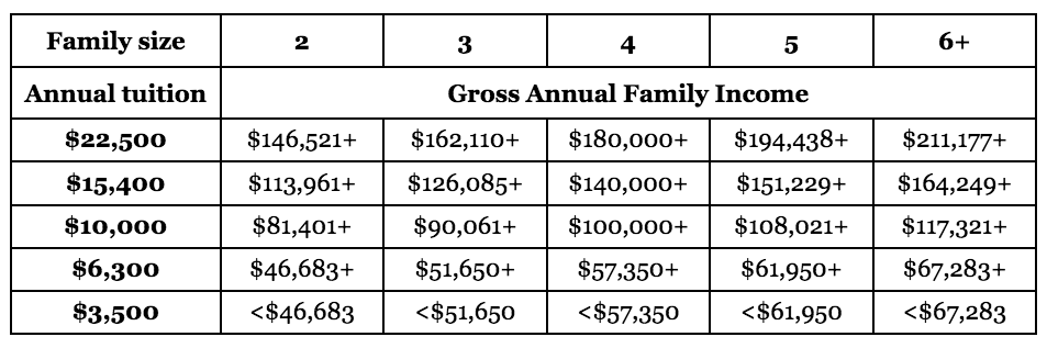 We are committed to ensuring that Hyacinth is accessible to families at all income levels. To this end, we offer tuition at a tiered rate so that each family contributes an equitable amount towards sustaining the school community. You can estimate your family’s contribution by finding your tuition on our tiered model below.